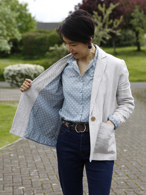 I used a light blue polka dot cotton purchased while on holiday in Malaysia. It was left over from lining my Heather Blazer; here's my matchy matchy look styled with my Ginger Jeans.